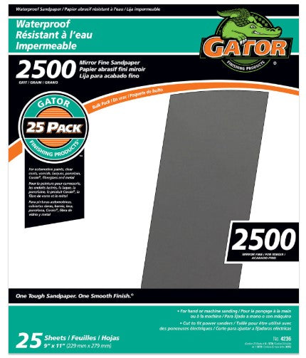 Gator waterproof sanding sheets are designed for applications where wet sanding is required. The paper backing is specially treated to maintain it's strength and shape even after being soaked in water for an extended period of time. The sharp, fast cutting silicon carbide grain works well on metal surfaces and between coats of paint, primers and sealers.